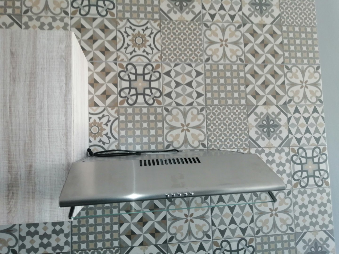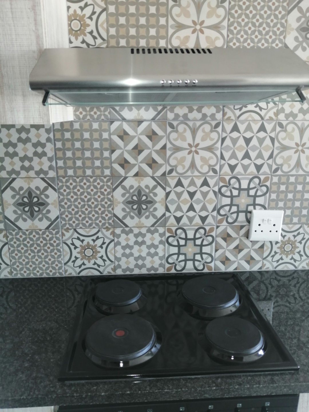 Kitchen with built-in cupboards, oven & hob